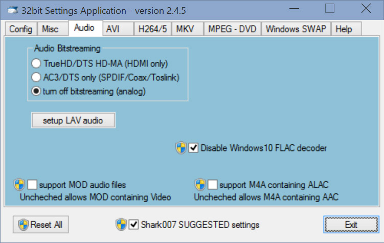 There are two different codec packs from Shark007. The advanced release contains a full suite of decoders with a GUI controller for the installed codecs. The standard codec release only contains LAV filters and xy-VSFilter with a GUI giving full control